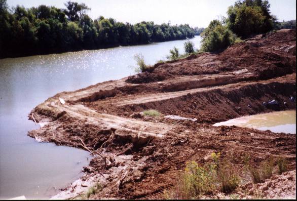 Once the slip is completed, this dam will be removed, and the slip will be flooded. The barge will be pushed into position and pumped full of water. Filling the barge will settle it on to the bottom of the slip and provide a stable loading platform for the dragline |