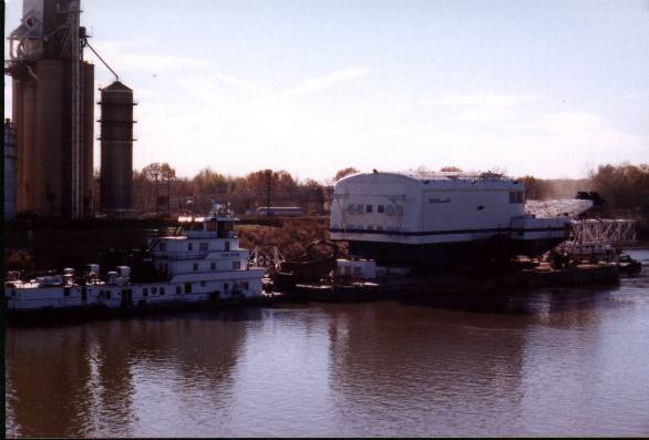 Heading downriver, toward Calhoun Ky, the dragline passes some grain silos.