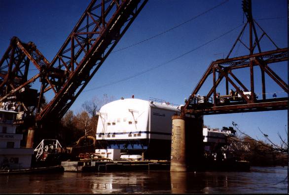 It wasn't long before the 1450 reached its first obstacle on the trip. This rail bridge had to be raised and some signal lines held up, while the dragline passed. Notice the crewmen on top of the 1450, as well as the rail crew on the bridge. holding the signal wires up. |