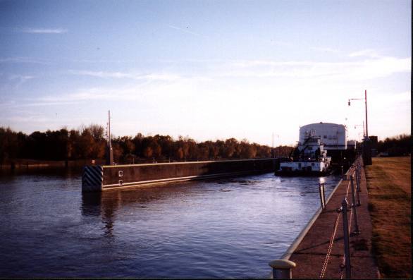 Now in the locks, the barge will be lowered to the level of the water in front of the dam.