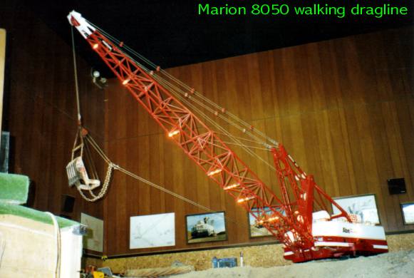 This model has a full size off-board operators cab. This cab used to have swing pedals, but has since been replaced with joystick controls. There are 3 SCR packages, all of the 8 thyristor, single phase input type. The same as the 8750 model. Hoist, drag and propel motions are all voltage regulator with current limits. Swing is a current regulator with voltage limit. The steel cables are 6 x 42 fibre core 700 lb test. The same as the 8750 model. This model also includes an hour meter to keep track of running time and a step counter to keep track of every step this model takes. A log book is also kept on this model. This model required 14 years to build. Parts of this model were made in Australia, Canada, New Zealand, North Africa, South Africa, The United States or wherever I (Jim) was building the big Marion machines. As you can see from the places Ive been, it took a while to complete. Specifications: