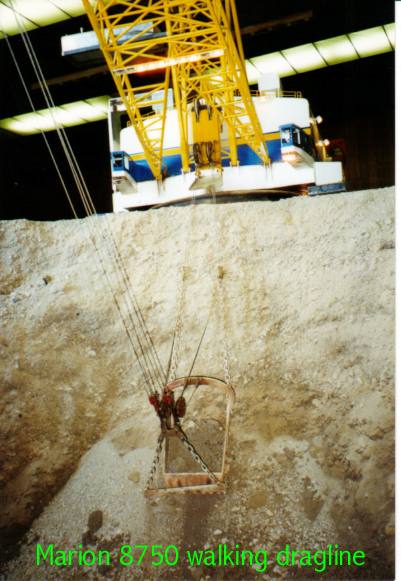 This model has an off board full size operators cab with swing pedals. This cab has full instrumentation . Zero center, 250 degree DC volt and ammeters , for use in electrical training. These meters are set up so one can see power draw and re-generation of electricity. Same as on the big machines. This model also has an ON BOARD joystick control. You can actually ride on board and swing with the model. This is reality, not a video game or tv set-up, this is as real as it gets. The on board control and portable seat can be located on the left side like Marion cabs, or the right side like Bucyrus-Erie cabs. The on board control can also be hand held to operate the model remotely. The model has fail safe brakes, spring set, electric release. Hoist, lower, drag and payout limits operate the same as on the full size machine. All interlocking of electrical circuits is identical to the full size machine. The hoist, drag and propel motions are voltage regulated with current limit. The swing motion is a current regulator with voltage limit. All three SCR packages ore of the 8 thyristor type single phase input, full reversing, full wave DC output and four quadrant drive. The same relay logic, isolation transformers are included in the miniature system. An MG starting panel with push buttons, pilot lights, and meters simulates the starting of exciter MG sets, main MG sets, and cooling blowers. There is over 3000 ft. of electrical wiring on the model. The boom has 6 main pendant cables and 2 intermediate support cables. The boom lights come on one row at a time automatically. The boom can be reaved and raised exactly like the full size machines with all electrical circuit changes made. In my career with Marion Power Shovel and Dragline World Consulting, I have raised or lowered approximately 99 booms. The steel cables are 6x42 stranding, 1/8" fibre core. 700 lb. breaking strength. This is the most flexible cable ever made in this size to the best of my knowledge. The four boom point sheaves are in two cradles and operate the same as the big ones. The four fairleads are also set up to operate exactly the same as their big brothers. The gear boxes are so real that they even leak oil just like the big ones! Each walking shoe on the model weighs 80 lb. The bucket weighs 43 lb. Loaded with dry material, the weight raises to 70 lb. and 100 lb. with wet material. An hour meter and step counter are on this model to keep records for maintenance purposes. A log book is also kept. This model required 3 years to build and was finished in 1985. It has been in operation ever since.